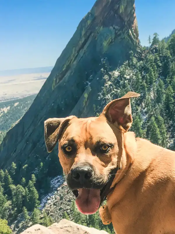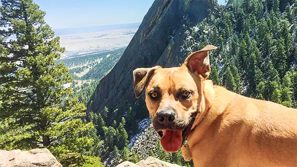 Smiling dog hiking off-leash on a mountain trail near Boulder, Colorado
