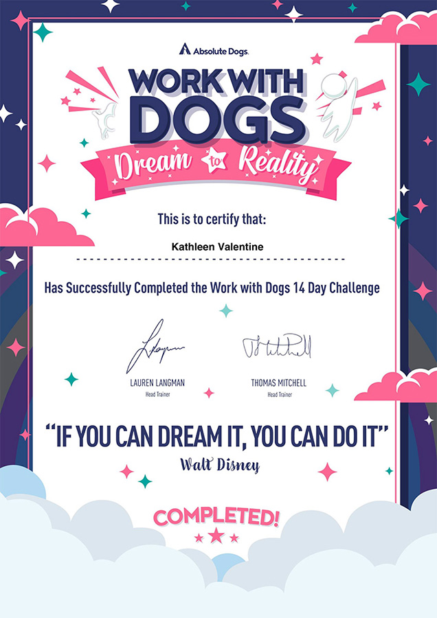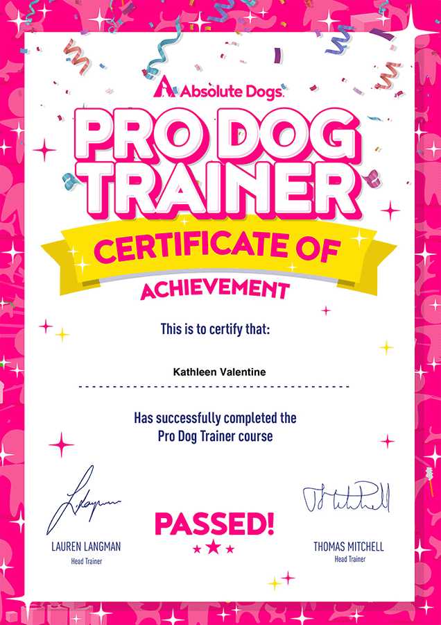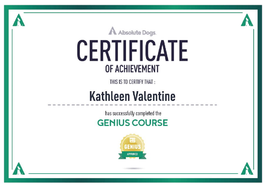 Awarded by Absolute Dogs (UK), this knowledge-assessed certification confirms Kathleen’s deep understanding of modern, science-based dog training. It covers advanced concepts in canine behavior, learning theory, and game-based training strategies.